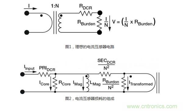 電流互感器(圖1)有三個(gè)突出優(yōu)點(diǎn):與線電壓隔離,無(wú)損測(cè)量電流,大信號(hào)電壓能很好地抵御噪聲。這種間接測(cè)量電流的方法要求用到變化的電流,例如交流電,瞬變電流或開關(guān)式直流電,來(lái)產(chǎn)生一個(gè)磁耦合到次級(jí)繞組里的變化磁場(chǎng)。次級(jí)測(cè)量電壓可以根據(jù)在初級(jí)和次級(jí)繞組間的匝數(shù)比實(shí)現(xiàn)縮放。這種測(cè)量方法被認(rèn)為是“無(wú)損的”,因?yàn)殡娐冯娏魍ㄟ^銅繞組時(shí)的電阻損耗非常小。但是,如圖2所示,由于負(fù)載電阻、芯損,以及初級(jí)和次級(jí)直流電阻的存在,互感器的損耗會(huì)導(dǎo)致失去一小部分能量。