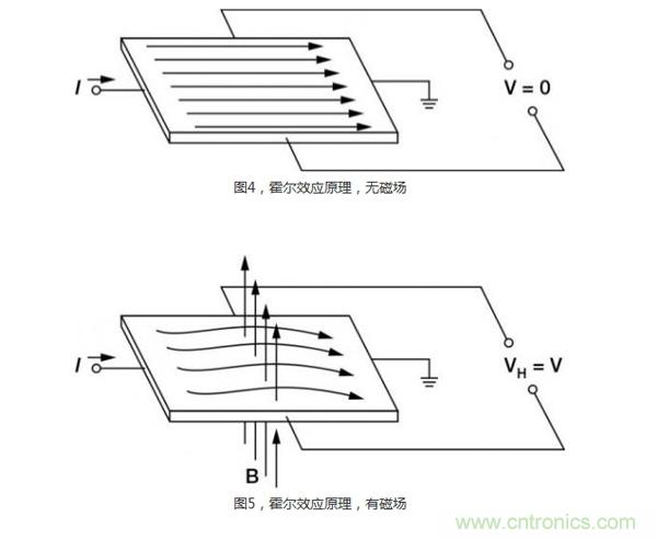 當(dāng)一個(gè)帶電流的導(dǎo)體被放進(jìn)磁場(chǎng)里時(shí)(圖4),在垂直于磁場(chǎng)和電流流動(dòng)方向上會(huì)產(chǎn)生電位差。這個(gè)電位與電流大小成正比。在沒有磁場(chǎng)和電流流過時(shí),就沒有電位差。但如圖5所示,當(dāng)有磁場(chǎng)和電流流過時(shí),電荷與磁場(chǎng)相互作用,引起電流分布發(fā)生變化,這樣就產(chǎn)生了霍爾電壓。