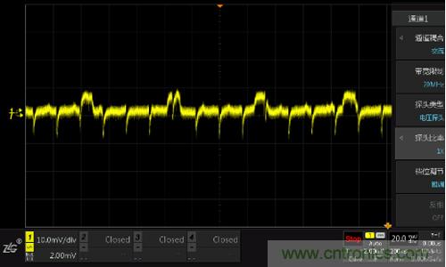 從圖5中可以看出,正確的紋波測量方式可以清晰的捕抓到正常的紋波,減少了不必要的噪聲和雜波對紋波的影響,基本上就是一條干凈的紋波了,在這樣的基礎(chǔ)上進(jìn)行電源紋波測量,可以更精確的測量紋波的值,進(jìn)而準(zhǔn)確估測電源質(zhì)量。