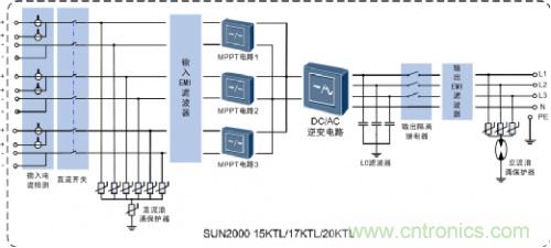 光伏逆變器由升壓回路和逆變橋式回路構成,升壓回路主要用于將直流電壓升壓至逆變器輸出所需直流電壓,逆變橋式回路主要用于將升壓后的直流電壓轉換為固定頻率的交流電壓。因此,經(jīng)升壓回路和逆變橋式回路完成將直流電轉換為交流點的功能。
