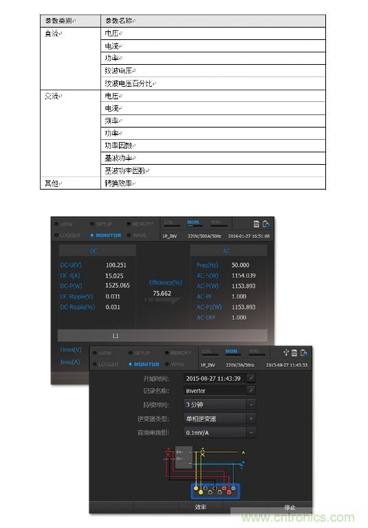 E6500電能質(zhì)量和能效分析儀可以快速測量逆變器轉換效率以及功率。目前支持單向逆變器與三相逆變器測量,主要測試功能如下: