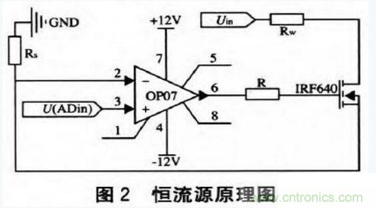 通過16位高精度模數(shù)轉(zhuǎn)換器ADSlll5輸出電壓給恒流源電壓轉(zhuǎn)換恒定電流電路,由于運(yùn)算放大器OP07是精度高、低漂移運(yùn)算放大器,并且在10歐負(fù)載的情況下輸出電流能達(dá)到2 A。所以采用OP07和IRF640組成的一個(gè)Uin。電流串聯(lián)負(fù)反饋來實(shí)現(xiàn)電壓到電流的轉(zhuǎn)換,具體電路如圖2所示。