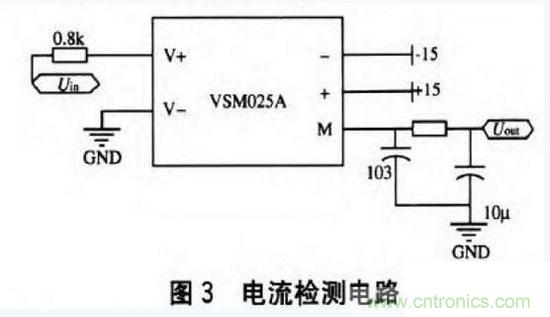 系統(tǒng)所要檢測的信號(hào)采用霍爾傳感器法檢測,如被測電源設(shè)備向該簡易直流電子負(fù)載輸入的電壓,以及流進(jìn)負(fù)載的電流。電壓和電流檢測分別通過電壓霍爾、電流霍爾傳感器檢測,并經(jīng)過必要的輸出轉(zhuǎn)換電路后轉(zhuǎn)換為檢測信號(hào)。為了提高系統(tǒng)的抗干擾性,檢測信號(hào)經(jīng)過一個(gè)低通濾波器濾除噪聲,再送入單片機(jī)的AD轉(zhuǎn)換器中。其中電流霍爾的原理圖如3所示。