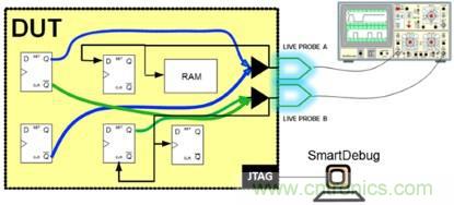 -現(xiàn)場(chǎng)探頭:允許采用兩個(gè)專用探頭,經(jīng)配置用于觀察邏輯元件中任何輸入或輸出的探測(cè)點(diǎn)(圖1)。然后,探頭數(shù)據(jù)可發(fā)送到示波器或甚至重新引導(dǎo)回到FPGA結(jié)構(gòu),驅(qū)動(dòng)內(nèi)部邏輯分析儀。這些探測(cè)點(diǎn)是實(shí)時(shí)動(dòng)態(tài)的。探測(cè)點(diǎn)可以通過(guò)軟件在運(yùn)行中更改,不需要把FPGA重新編譯或重新編程。
