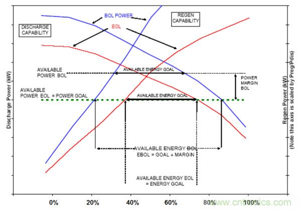 同時電池企業(yè)用以評估電池壽命終結的方法(容量衰減至BOL時的80%以下或內阻增加50%以上)是比較籠統的。作為整車廠可以根據實際性能需求進行更準確的EOL確認。下圖以一款混合動力車型電池壽命分析為例:兩條藍線分別是BOL時刻的充放電功率特性,綠色虛線為整車實際需求工況。則在BOL狀態(tài)下電池在20%~90%SOC區(qū)間內都滿足整車功率需求,在可用能量上有一定的富裕。隨著電池性能的衰減,兩條紅線代表了功率性能的下降,其可用SOC區(qū)間為40%~75%,到達EOL零界點。一旦繼續(xù)衰減可用容量就無法滿足整車需求。