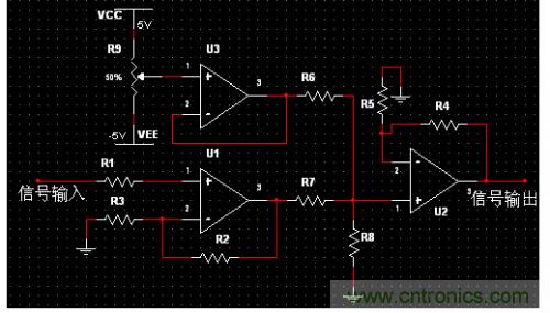 開關(guān)CD4051來連接不同的電阻,不同的R1,R2通過公式:這樣就可以實現(xiàn)程控放大功能了??烧{(diào)電阻R9用來設(shè)置信號調(diào)理電路加入的直流分量的大小。放大后的信號和直流分量最后由U3模擬加法器疊加后輸出。