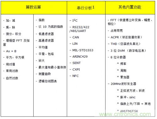 ·測(cè)量和分析。示波器針對(duì)易用性和測(cè)量速度進(jìn)行了優(yōu)化。它們的硬件中內(nèi)置了各種測(cè)量和分析工具。如果是臺(tái)式示波器,用戶可以從臺(tái)式儀器的前面板訪問(wèn)這些測(cè)量和工具,如果是模塊化儀器,用戶可以從軟件前面板訪問(wèn)。這使得示波器非常適合用于在設(shè)計(jì)或故障診斷期間進(jìn)行的各種常見(jiàn)測(cè)試。由于測(cè)量在硬件中執(zhí)行,因此可以快速獲取結(jié)果,縮短測(cè)試臺(tái)或 ATE 環(huán)境的測(cè)量時(shí)間。以下所示為 InfiniiVision 系列示波器中提供的一些算數(shù)運(yùn)算、FFT 和串行協(xié)議分析工具。