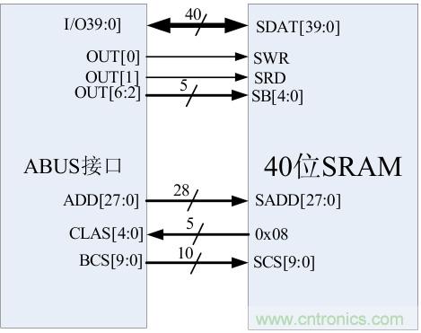 40位SRM模塊與NIOSII通過ABUS連接,實(shí)現(xiàn)正確的時(shí)序讀寫操作。測試時(shí),一次只測試8位,分5次完成所有空間的測試。如圖2-4。表4是詳細(xì)的信號(hào)連接說明。