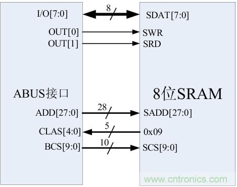 8位SRM模塊與NIOSII通過ABUS(FPGA)連接,實(shí)現(xiàn)正確的時(shí)序讀寫操作。如圖2-5。表5是信號(hào)連接說明。