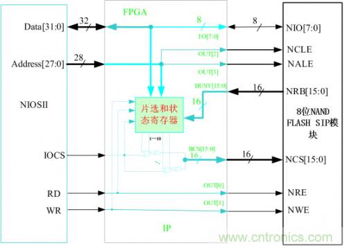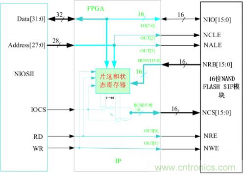16位的NAND FLASH存儲(chǔ)器芯片可以有多種組合方式,可以用多個(gè)16位的NAND FLASH組合,也可以用多個(gè)8位的NAND FLASH組合。這里我們假設(shè)16位的SIP NAND FLASH產(chǎn)品是由多個(gè)16位的NAND FLASH組合而成,下面的IP核是根據(jù)它的結(jié)構(gòu)來設(shè)計(jì)的。