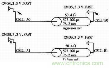 由于頻率的提高,傳輸線之間的串?dāng)_明顯增大,對信號完整性也有很大的影響,可以通過仿真來預(yù)測、模擬,并采取措施加以改善。以CMOS信號為例建立仿真模型,如圖6所示。在仿真時(shí)設(shè)置干擾信號的頻率為66MHz的方波,被干擾者設(shè)置為零電平輸入,通過調(diào)整兩根線的間距和兩線之間平行走線的長度來觀察被干擾者接收端的波形。仿真結(jié)果如圖7,分別為間距是203.2mm、406。4mm時(shí)的波形。