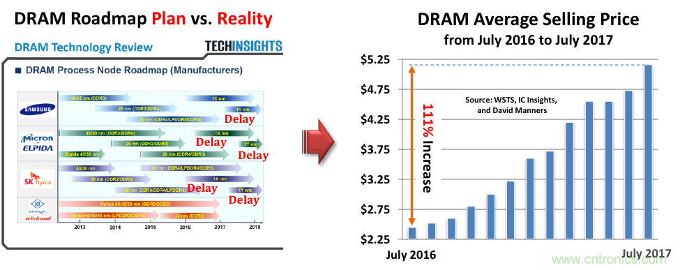 圖1:DRAM發(fā)展藍(lán)圖的計劃與現(xiàn)實。(來源:WSTS、IC Insights、David Manners)