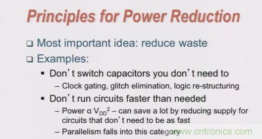 •降低電壓:電壓受頻率影響,可以通過降低頻率來降低所需電壓。當頻率降低,電路開關(guān)速度降低,就能有更多時間去進行充電,因此所需充電電壓就能降低(電壓越大充電速度越快)。同時,可通過流水線分割組合邏輯。若同時保持頻率不變,電路能有更多時間去進行充電,從而降低所需充電電壓。