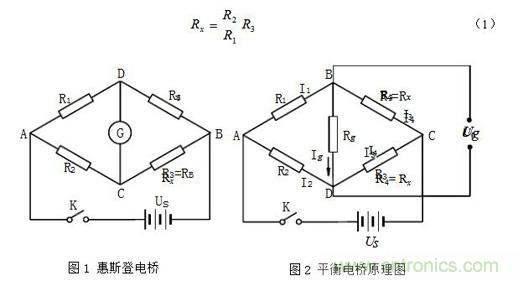 惠斯登電橋(平衡電橋)的原理如圖1所示,調(diào)節(jié)R3使檢流計(jì)G無(wú)電流流過(guò)時(shí),C、D兩點(diǎn)等電位,電橋平衡,從而得到