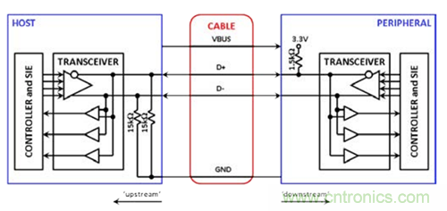 2. 它必須管理USB電纜上的雙向通信,確保其收發(fā)器在適當(dāng)?shù)臅r候進(jìn)行發(fā)送和接收,并精確重現(xiàn)所有驅(qū)動和空閑狀態(tài)。若要精確重現(xiàn)空閑狀態(tài),它必須在其上游側(cè)配置上拉電阻,以模擬連接下游外設(shè)的上拉電阻狀態(tài)。它在下游側(cè)也需配置下拉電阻。必須監(jiān)控總線上表示總線空閑、分組開始和分組結(jié)束的信號,以便正確響應(yīng)這些狀況。