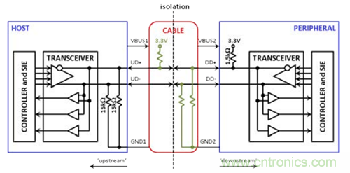 一種可能的隔離方法如圖2a所示。圖中,虛線表示隔離在理論上將USB電纜分割。D+和D–的狀態(tài)信息可以跨越隔離柵,但電流不能。GND1節(jié)點(diǎn)(上游的接地基準(zhǔn))現(xiàn)在與GND2節(jié)點(diǎn)(下游的接地基準(zhǔn))相互分離。不幸的是,隔離使主機(jī)無法“看到”下游的上拉電阻,而外設(shè)無法“看到”上游的下拉電阻。因此,需要使用一些額外的電阻,如圖2b所示,以便跨越隔離模仿相應(yīng)連接。在這個“透明”概念中,主機(jī)與外設(shè)之間的通信方式和圖1中的非隔離式連接十分類似。透明的USB