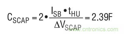 在后備模式中,當超級電容器組上的電壓開始接近VOUT 時,在計算 tHU 結(jié)束時超級電容器上的最小電壓必須將兩個超級電容器的 ESR 和 LDO 的輸出電阻考慮在內(nèi)。假設每個超級電容器的 ESR 為 100mΩ,而 LDO 輸出電阻為 200mΩ,這將由于 50mA 待機電流的原因而使VOUT (MIN)增加20mV。VOUT (MIN)設定為3.1V,從而在超級電容器組上產(chǎn)生一個1.88V的放電電壓 (?VSCAP)?,F(xiàn)在,可以確定每個超級電容器的大小。