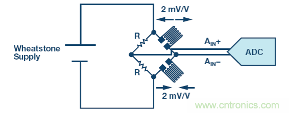 應(yīng)變計(jì)的靈敏度通常為 2 mV/V?;菟沟请娫丛礁?,靈敏度也就越高。為了增加應(yīng)變計(jì)的動(dòng)態(tài)范圍并最大化 SNR,電橋可能采用比 ADC 更高的電源供電。