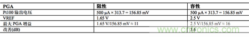 表 2 總結(jié)了阻性 PGA 相對于容性 PGA 的最大增益,最大電流源為 500 µA,限制了 Pt100 的自發(fā)熱(假定 B 類 RTD,此時(shí)最高溫度為 600°C,最大 VREF 為 2.5 V)。