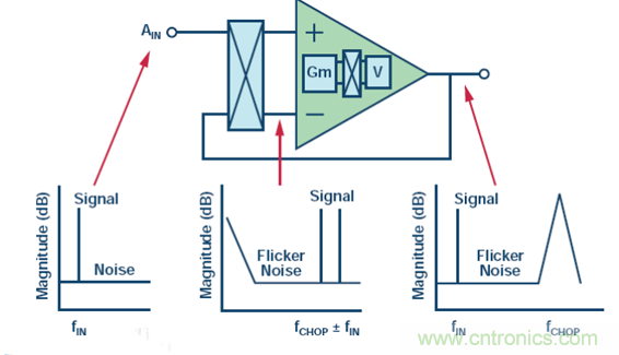 對輸入進(jìn)行斬波之后,輸入頻率便調(diào)制到較高頻率。緩沖器失調(diào)和閃爍噪聲依然保持其最初的低頻率,因?yàn)樗鼈儾皇茌斎霐夭ǖ挠绊憽?/div>