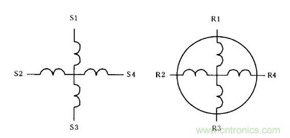 如上圖1所示,S1-S3作為勵磁繞組,S2-S4作為定子交軸繞組,兩者空間互相垂直且匝數(shù)、型式完全相同。R1-R3和R2-R4分別為轉子上的正弦輸出繞組和余弦輸出繞組,它們的結構也完全相同。