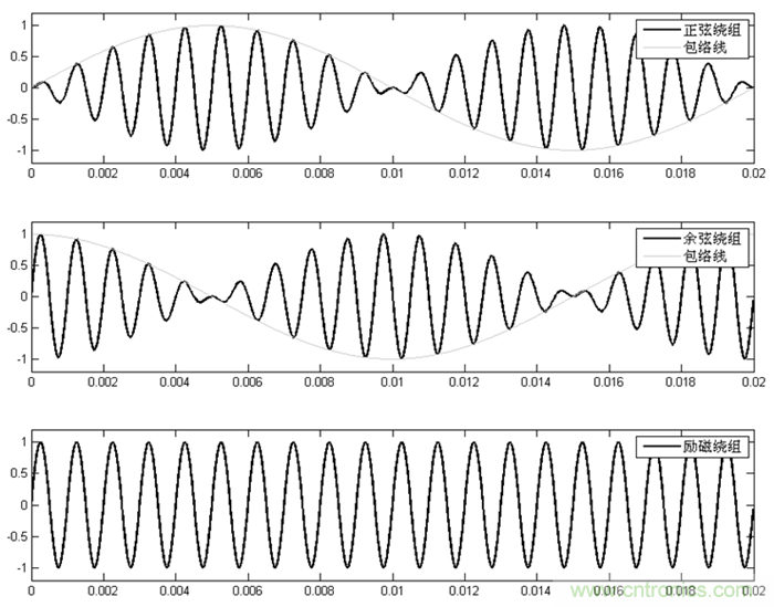 正弦繞組和余弦繞組輸出為調幅波,其包絡線分別為正弦波和余弦波,包絡線的頻率為50Hz,對應轉子的轉速,正弦繞組和余弦繞組的幅值的比值的反正切就是轉子的轉角。