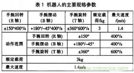 確定了空間結構和手腕結構后,可確定手腕回轉(zhuǎn)、手腕擺動及手腕旋轉(zhuǎn)三個姿態(tài)的自由度。其參數(shù)見表l (參數(shù)來于SSA2000工業(yè)機器人)。