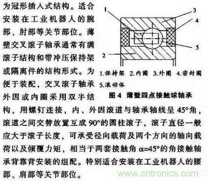 球軸承是機器人和機械手機構中最常用的軸承。它能承受徑向和軸向載荷,摩擦較小。其機器人專用軸承四點接觸式設計以及高精度加工。這種軸承比同等軸徑的常規(guī)中系列四點接觸軸承輕25倍。它的內(nèi)圈(或外圈)由兩個半圈精確拼配而成,而其整體外圍(或內(nèi)圈) 的溝曲率半徑較小,使鋼球與內(nèi)、外圈在四個“點”上接觸。既加大了徑向負荷能力,又能以緊湊的尺寸承受很的兩個方向的軸向負荷,并且有很好的兩個方向的軸向限位能力,因為它的軸向游隙相對較小。而其接觸角 (一般取為35)又較大。工業(yè)機器人專用薄壁四點接觸球軸承通常有帶密封圈和不帶密封圈的結構形式(見圖4)。其主要由內(nèi)圈、外 圍、保持架、鋼球或非接觸式密封圈組成。內(nèi)、外圈均為整體結構。鋼球與內(nèi)、外因溝道呈四點接觸.保持架為冠形插入式結構。