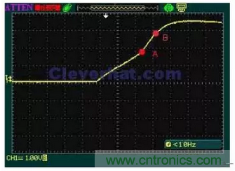 過B點后電流再次出現(xiàn)拐點,那時因為電容放電后電壓下降并且采樣電壓上升,使得加電感上的電壓降低引起。
