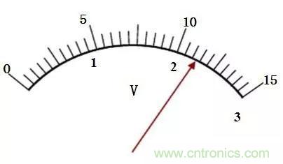 若是0~15V檔,最小分度值為0.5V, 半格為0.25V,通??晒雷x為0.2V或0.3V。(因有效數(shù)字出現(xiàn)在以V為單位的十分位上)。圖中讀數(shù)應(yīng)為 11. 2V或11.3V。