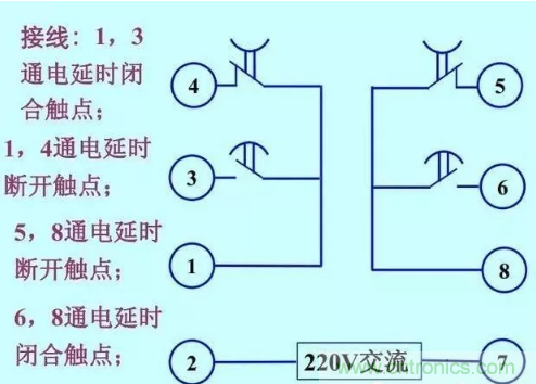 6-8腳為通電延時(shí)斷開觸點(diǎn),接通電源,給了信號之后線圈得電,等到設(shè)置時(shí)間到達(dá)以后,觸點(diǎn)斷開;