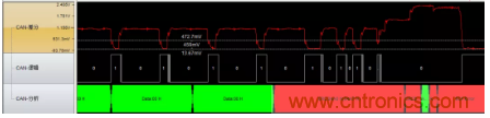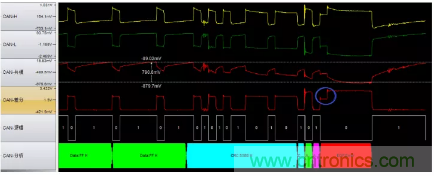 圖6波特率異常(位寬度從2us突然變成1.6us),導(dǎo)致位錯誤引起錯誤幀。位寬的不穩(wěn)定是波特率不穩(wěn)定導(dǎo)致的,最有可能的原因是晶振問題,建議更換晶振測試。
