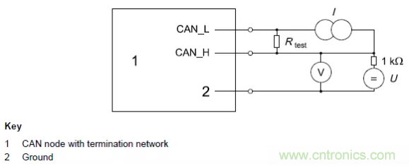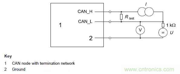 一個CAN節(jié)點集成電路協(xié)議設置為總線空閑時,可檢測到的隱性位輸入限值應通過圖 1的電路測量。其中I的值是指可以產(chǎn)生使節(jié)點在隱性狀態(tài)下檢測到隱性位的最大差分輸入電壓的電流值。電壓源U的電壓為: