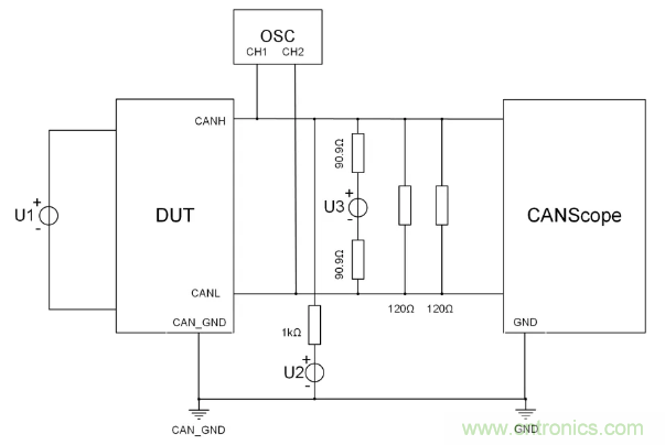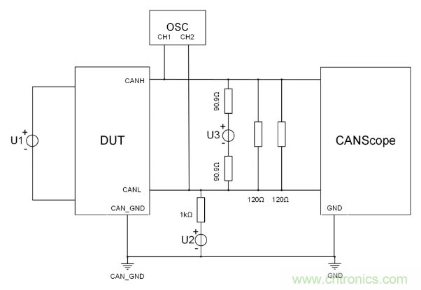 斷開電壓源U3,調(diào)節(jié)電壓源U2,逐步將共模電壓調(diào)到6.5V或-2V,在此期間DUT應能正常發(fā)送報文;