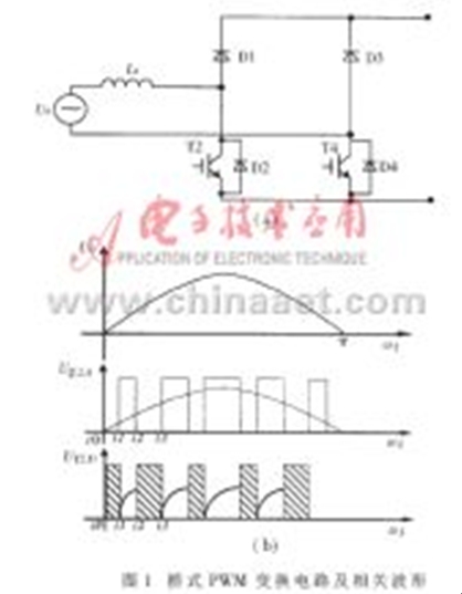 圖1(a)所示為工作在PWM整流狀態(tài)的H型橋式PWM變換電路(此圖為正弦波正半波輸入下的等效電路,上半橋的兩只IGBT未畫出),圖1(b)為下半橋兩只大功率器件的驅(qū)動信號和相關(guān)的器件波形?,F(xiàn)以正半波工作過程為例進(jìn)行分析(對于三相PWM電路,在整流、逆變工作狀態(tài)或單相DC/DC工作狀態(tài)下,PWM電路的分析過程及結(jié)論基本類似)。