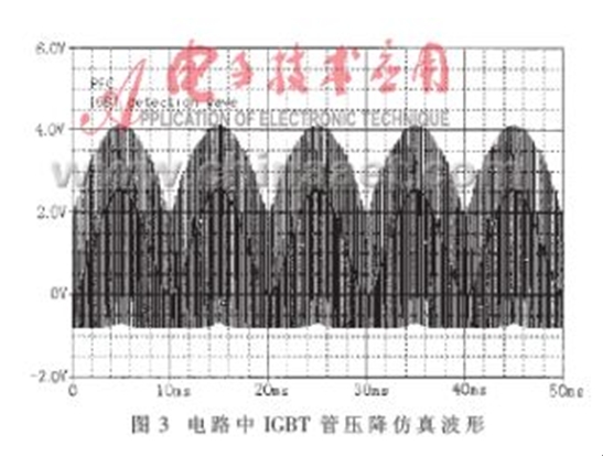 當(dāng)圖1所示的PWM變換器工作在單相高頻整流模式下,應(yīng)用PSPICE仿真軟件對圖2所示的電路進(jìn)行仿真研究,可以得到如圖3所示的結(jié)果。圖3所示的仿真波形相當(dāng)于在圖2電路中IC5B的第7腳觀察到的信號波形。仿真結(jié)果表明,檢測電路可以快速、有效地將PWM變換器的下管導(dǎo)通時的管壓降檢測出來。圖4所示波形是實際電路工作時檢測到的相關(guān)波形。圖中,1#通道顯示的是單相高頻整流電感電流的給定波形,2#通道顯示的是實際檢測到的圖2電路中IC5B的第7腳的工作波形。比較圖3和圖4可以得出,該檢測電路可以快速、有效地檢測出IGBT導(dǎo)通時的管壓降,從而對IGBT實施有效的保護(hù)。