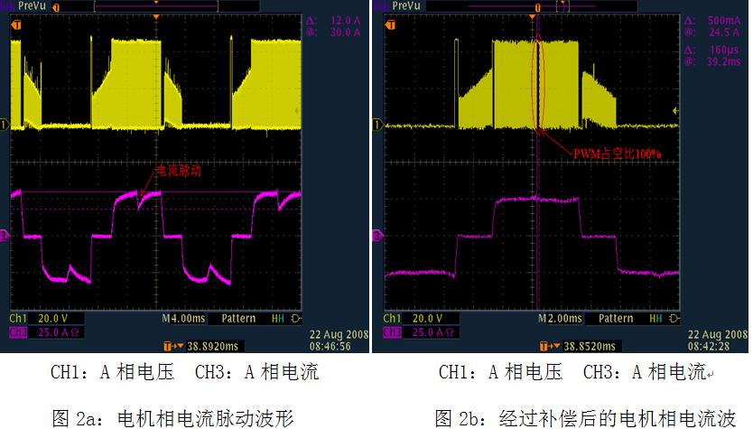 圖2b是采用XC866控制芯片的系統(tǒng)在經(jīng)過上述方法優(yōu)化后測得的換相電流波形,由圖2b可以看出,換相時的電流脈動基本消除,電機(jī)的相電流基本接近方波。用了這套控制系統(tǒng)的電動車,起步加速以及運(yùn)行時的電機(jī)震動已基本消除,實現(xiàn)了超靜音控制器的設(shè)計。