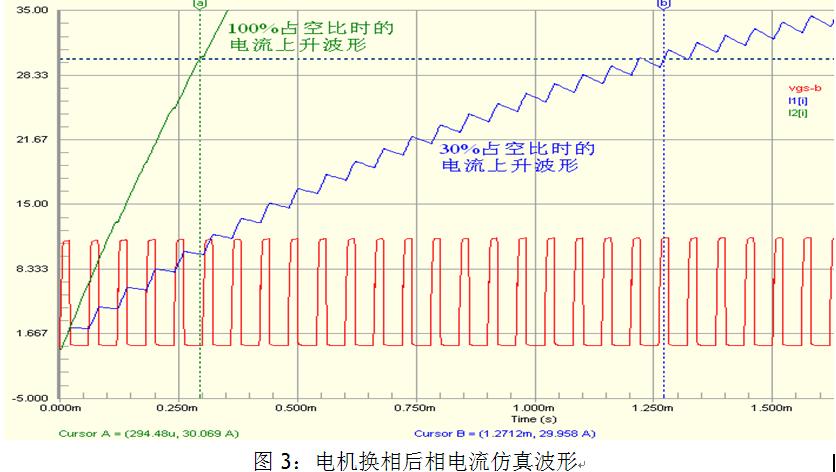 由于在低速大負(fù)載運(yùn)行時,電機(jī)的旋轉(zhuǎn)反電勢很小,為了使電機(jī)的相電流不超過允許的最大值,PWM占空比通常比較小,這使得換相后新的相繞組電流上升緩慢。圖3中是電機(jī)換相時的電流仿真波形。電機(jī)兩相之間的電感為Lm=0.4mH,內(nèi)阻Rm=0.28歐姆(實際電機(jī)的參數(shù))。采用AOS(萬代半導(dǎo)體)生產(chǎn)的AOT460 MOSFET進(jìn)行仿真。MOSFET的PSPICE模型采用level3等級。由圖3中可以看出,如果PWM占空比為30%,則電流由零上升到30A需要約1.3ms。這與圖2a中實測的波形相仿。為了使換相后電流迅速上升,我們可以使換相后PWM占空比為100%來對電流進(jìn)行補(bǔ)償,直到電流上升到換相前的電流值,這樣可以使換相電流的波動盡可能的小,時間盡可能地短。由仿真波形中I2可以看出,電流上升到30A的時間小于300us。