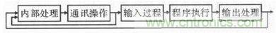 在延遲控制中,傳統(tǒng)的繼電器控制技術(shù)依靠設(shè)備的滯后性實(shí)現(xiàn),定時(shí)精度較差,在操作時(shí)不易調(diào)整時(shí)間。而PLC監(jiān)視控制是時(shí)鐘脈沖由晶體振蕩器引起的,可操控時(shí)間,且精度較高。PLC控制雖與微電腦技術(shù)相似,但工作方式卻不同。PLC技術(shù)采用循環(huán)掃描,而微機(jī)則采用鍵盤掃描,圖1是PLC技術(shù)的工作掃描方式。