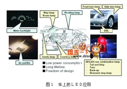 LED已經(jīng)廣泛的應用于車內的相關照明或指示用光源,由圖1可知,從車內的儀表板燈、車頂燈、化妝燈、迎賓燈等,到車外的尾燈、前后轉向燈、倒車燈、第三剎車燈等都可見到LED的相關應用。
