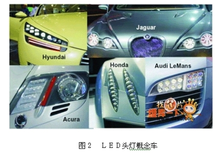 從LED的應用歷史來看,早在1992年時已經(jīng)有LED應用于第三剎車燈上的先例;而在2000年時則進一步的應用于尾燈、轉向燈與剎車燈;到了2002年Audi?。粒嘎氏葘ⅲ蹋牛墓庠粗糜谇爸脽艟邇茸鳛槿招袩?,開啟了設計師與工程師們在前置燈具的想象空間。在之后的許多國際車展上都可以看到LED作為前照燈源的概念車,如圖2所示。