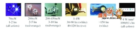 而尾燈組對于亮度需求約300 ̄500lm,一般選用1W的SMT封裝結構,單體封裝亮度約10 ̄20lm,效率可達15 ̄40lm/W。以上都是已經(jīng)應用于車體的光源,而目前LED廠與車廠正積極合作,試著將LED導入前照系統(tǒng)(頭燈、霧燈)中,其中車廠對于頭燈的亮度需求約2000流明的白光,LED廠目前則應用高瓦數(shù)的SMT?。蹋牛姆庋b架構,每單體封裝可輸出100 ̄200lm,效率預期提高至50 ̄100lm/W。