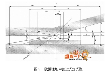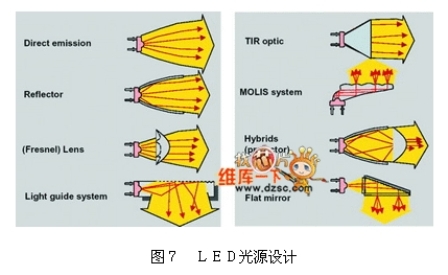光學設計時先考慮法規(guī)需求,討論視角與強度關系,以近燈為例須針對其特殊的15度揚角設計,如圖5所示。在傳統(tǒng)的燈具設計上由先期的利用反射罩配合透鏡刻紋作角度與強度的控制,演變成為利用反射罩直接控制強度角度,也發(fā)展出利用成像方式的魚眼透鏡設計法。不論何種的設計方式都須先考慮選用光源的特性,特別是角度與強度的光型輸出(Beam pattern),對傳統(tǒng)的光源而言,大多為柱狀光源,可產(chǎn)生類似蝴蝶外型的光型輸出,進而發(fā)展出來與之搭配的透鏡、反射罩、擋板、透鏡等光學組件。而利用LED作為光源設計燈具時,需重新考慮其光學特性由傳統(tǒng)的柱狀光源變?yōu)槠矫婀庠矗ú煌姆庋b設計有不同的光型輸出),進而搭配外部的光學組件而產(chǎn)生不同組合以應用于不同產(chǎn)品,依照德國車燈大廠HELLA的設計分類,可將光源分為八大類,如圖6 所示。LED目前的單位面積發(fā)光量尚不及鹵素燈泡與放電式燈泡,想得到相同的流明輸出,LED需要較大的封裝面積。隨著光源輸出面積的增加,光學設計的難度也隨之提升,所以在現(xiàn)有的概念車上,都以模塊化光學設計取代既有的單一燈室設計,利用多組燈源達到傳統(tǒng)燈具的照明水平,除了降低光學設計的難度,也增加車體造型的設計感。