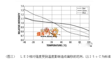 這類LED光源的簡單開迴路架構方式有個潛在的問題,由于LED的光學特性會受到運作條件的影響,因此組合后的RGB光源輸出的亮度以及色度都會變化。同時,每顆LED元件也不盡相同,因此造成RGB光源的輸出產(chǎn)生更多變化,(圖二)與(圖三)就描述了幾個LED變動的范例。
