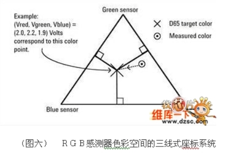 基本上來說,三色光感測器會產(chǎn)生一個三維色彩規(guī)格系統(tǒng),因此稱為RGB感測器色彩空間,這個系統(tǒng)可以讓特定色彩由感測器的輸出電壓來指定,例如具備特定亮度的D65白光可以記錄為:(Vred,?。郑纾颍澹澹?,?。郑猓欤酰澹剑ǎ玻?,?。玻玻。保梗觯铮欤簦?。