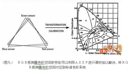 系統(tǒng)A中的三色光感測器在達成D65光輸出時,會產(chǎn)生以上的電壓位準,但對系統(tǒng)B的光感測器,雖然達到和A系統(tǒng)一樣的D65光輸出,卻會產(chǎn)生不同的電壓位準組合。換句話來說,由RGB感測器色彩空間所定義的色彩規(guī)格系統(tǒng)在每個系統(tǒng)都不一樣。