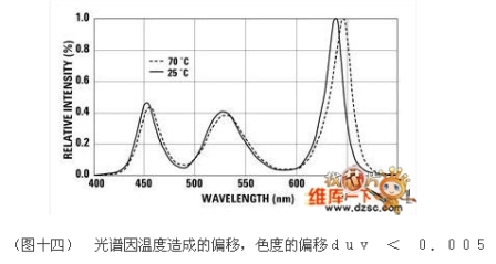 (圖十四)描述了溫度上升時對LED光譜的重大影響,這項資料由9000K白光目標色的閉回路系統(tǒng)取得,雖然光譜曲線出現(xiàn)大幅度的偏移,但duv依然維持在0.005以下。