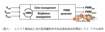 ASSP整合了一系列可以分析三色光感測器色彩資訊,并計算達成目標色的設定點及PWM驅動信號大小的一系列演算法。ASSP以大約每秒一百次的速度對光感測器進行取樣,以確保PWM信號的持續(xù)定期調整不會被人眼察覺,如前面所提,ASSP同時也包含一個可以避免LED老化而造成RGB光源輸出色度改變的演算法。
