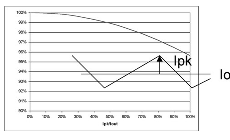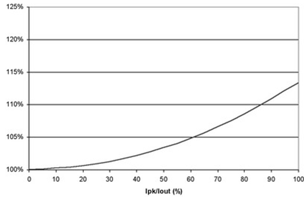 圖4 也闡明了即使在紋波電流較大的時(shí)候,對(duì)功耗也沒有重大影響。例如,50%的紋波電流僅增加不足5%的功率損耗。當(dāng)大大超過此水平時(shí),需要減小電源的DC電流以保持結(jié)溫不變,從而維持半導(dǎo)體的使用壽命。經(jīng)驗(yàn)法則顯示,結(jié)溫每降低10%,半導(dǎo)體使用壽命就會(huì)延長兩倍。并且,許多設(shè)計(jì)都傾向于更小的紋波電流,這是因?yàn)殡姼衅鞯南拗啤=^大多數(shù)電感的設(shè)計(jì)處理能力小于20%的Ipk/Iout紋波電流比率。