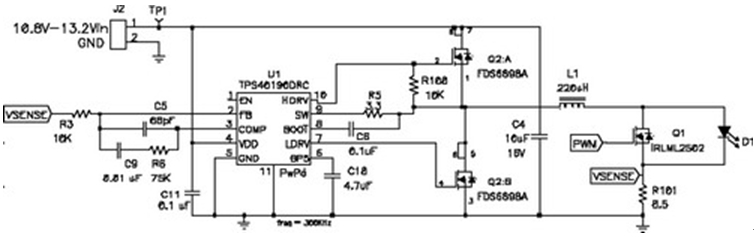 通常需要對(duì) LED 進(jìn)行調(diào)光。例如,需要調(diào)節(jié)顯示器或建筑照明的亮度。實(shí)現(xiàn)上述目標(biāo)有兩種方法:降低 LED 的電流,或快速對(duì) LED 進(jìn)行開關(guān)操作。更有效率的方法是降低電流,因?yàn)楣廨敵霾⒉煌耆c電流呈線性關(guān)系,并且,LED 的色譜在電流小于額定值時(shí)會(huì)發(fā)生變化。人們對(duì)亮度的感知是指數(shù)型的,因此,調(diào)光可能需要對(duì)電流進(jìn)行很大更改,這會(huì)對(duì)電路設(shè)計(jì)造成很大的影響??紤]到電路的容差,滿電流值工作時(shí),3%的調(diào)節(jié)誤差可以造成10%負(fù)載時(shí)的30%或更高的誤差。通過電流波形的脈寬調(diào)制 (PWM) 進(jìn)行調(diào)光更為準(zhǔn)確,盡管這種方法存在響應(yīng)速度問題。在照明和顯示器應(yīng)用上,PWM頻率高于 100Hz,以使肉眼感覺不到閃爍。10% 的脈沖寬度在ms量級(jí)內(nèi),并要求電源的帶寬大于 10kHz,此項(xiàng)工作可以通過圖8(A 與 C)中簡單的環(huán)路完成。圖9為帶 PWM 調(diào)光功能的降壓功率級(jí)電路。在本例中,LED 輕松地閉合/斷開電路。通過這種方式,控制環(huán)路總是處于激活狀態(tài),并實(shí)現(xiàn)了極快的瞬態(tài)響應(yīng)。